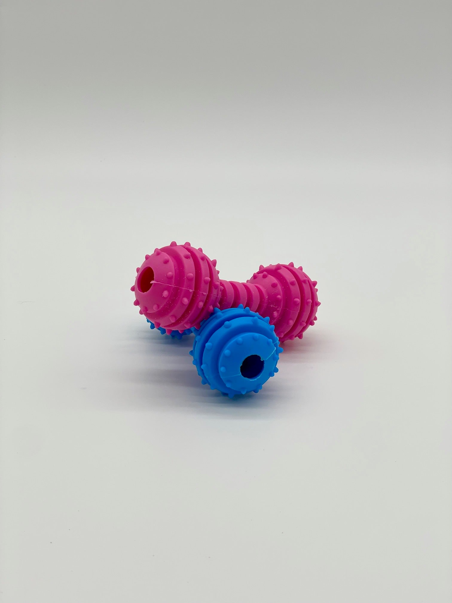 The Chomper Bell contains bells in both ends of the dumbell which is flexible yet durable for dogs that love to chew or cats that love the bell. The Chomper Bell Chew Toy is a flexible yet durable toy for hours of playtime. It's made of a non-toxic, flexible rubber material and is safe for dogs and cats that love to chew.